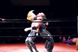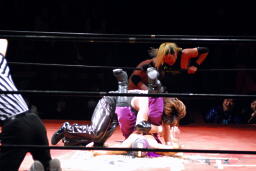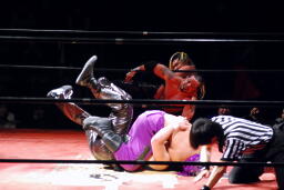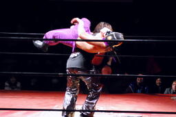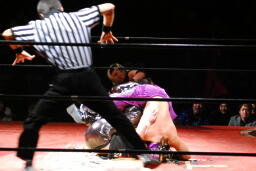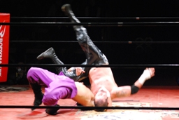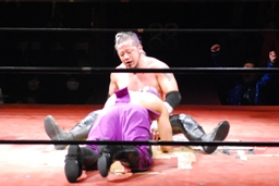 菅原垂直落下式ブレーンバスター(左写真)、カウント2。