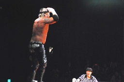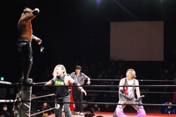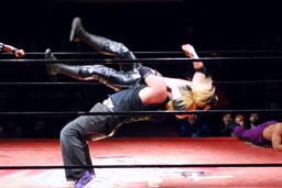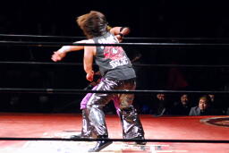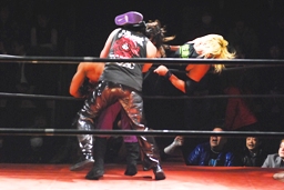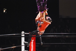 政宗コーナーに上る、しかし葛西が雪崩式ブレーンバスターに(右写真)。