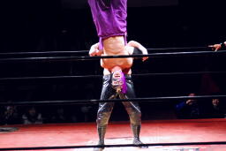 政宗バック取らせたままロープに突っ込む、藤田がロープ越しにハイキック(左写真)