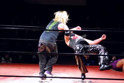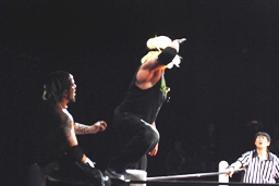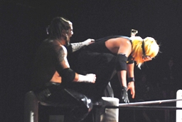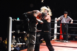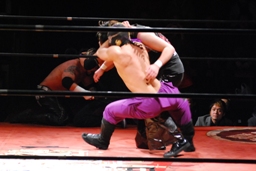 葛西が政宗にロープ越しのエルボー(右写真)、