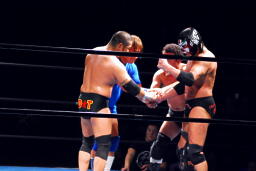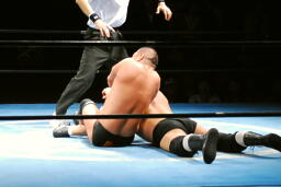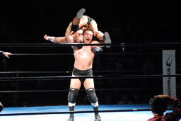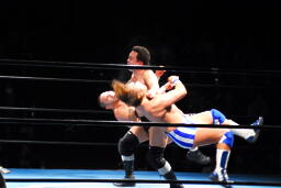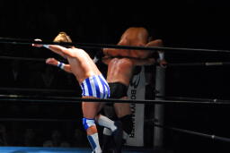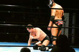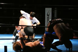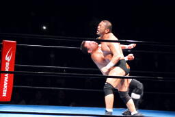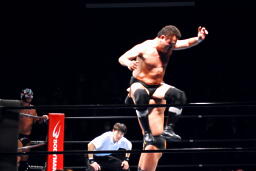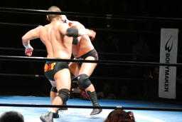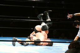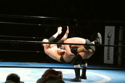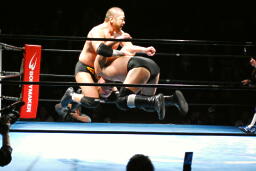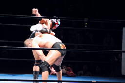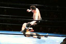 東郷をコーナーに振って沼二郎が串刺しヒップアタック(右写真)。