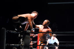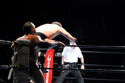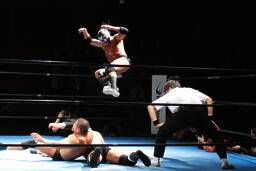 コーナーに上ってダイビングセントーン(右写真)、カウント3。