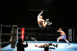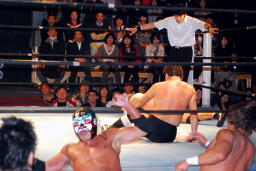 東郷コーナーに上るが沼二郎はヘッドバットで落としてダイビングヒップアタック(右写真)、カウント2。