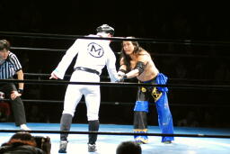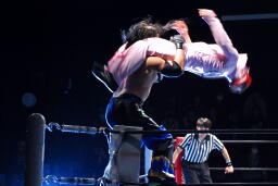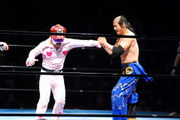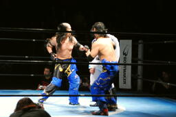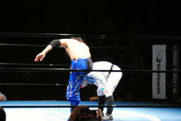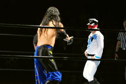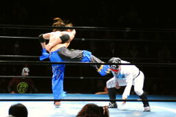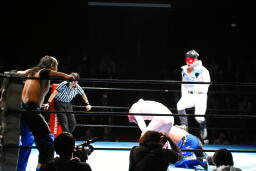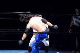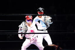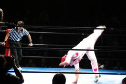 秀腕をひねる(左写真)、2号切り返す。秀ヘッドロックからフライングメイヤー、2号ヘッドシザーズでブレーク。ロックアップ、秀が腕取ってハンマーロックからネックロック、恵にタッチ。