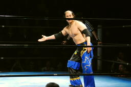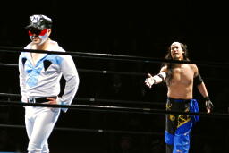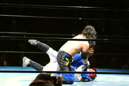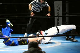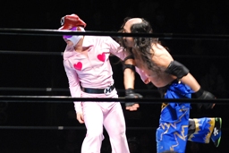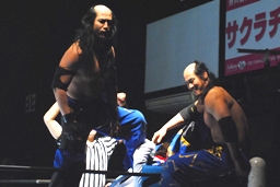腕を回してダブルのダスティ(右写真)。秀スリーパー、1号ロープ。10分経過。