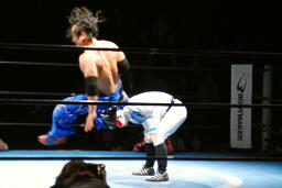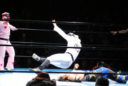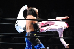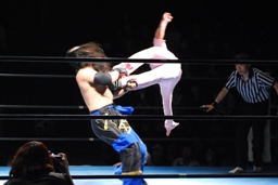 ダブルのドロップキック(右写真)でリング下に落とし、