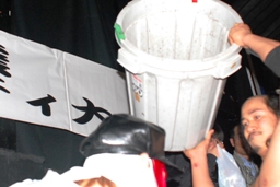 1号と秀は南側ひな壇でポリバケツをぶつけ合う(右写真)。2号と恵は花道で乱闘。