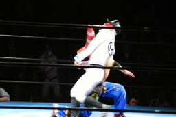 リングに戻すと秀がラリアットwithカラーコーン(左写真)。恵入ってパンチ、ニードロップ、2号がカット。秀が2号を場外に出す。