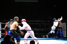 1号切り返してリバースチキンウィング(左写真)。1号コーナーに押し込んで2号にタッチ。恵ガットショット、秀にタッチ。