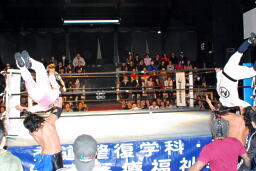 1号入ってダブルのクローズライン、1号エルボードロップ(左写真)、カウント2。恵がコーナーに押し込むと秀が水を噴き掛ける。ここから場外戦に。