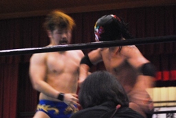 日向寺はトップロープにサスケのノドを押し付ける(左写真)。首投げからドロップキック、カウント2。ストンピング、ボディスラムからカバー、カウント2。サスケエルボー、日向寺ガットショット、再びロープでチョーク。15分経過。