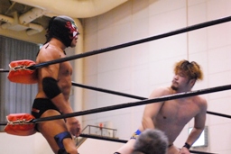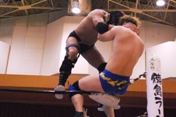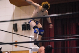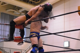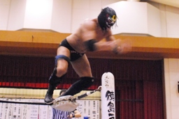 サスケWARスペシャル、リリースしてボディスラム。ゆっくりとコーナーに上って(左写真)ラム・ジャム、日向寺当然のようにかわす。