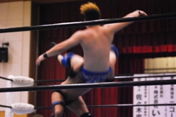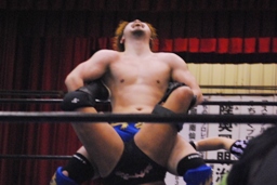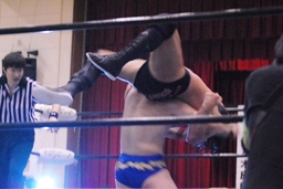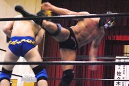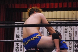 サスケ今度は雪崩式ブレーンバスター狙うが日向寺はヘッドバットで落としてダイビングエルボードロップに(右写真)、カウント2。