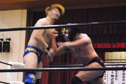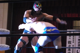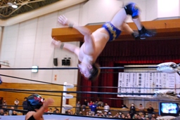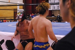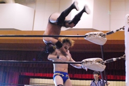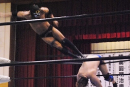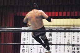 日向寺対角線コーナーにサスケを振ると串刺しのスピアー、サスケかわして日向寺は場外転落。サスケはコーナー越しのトペ・コン・ヒーロに(左写真)。