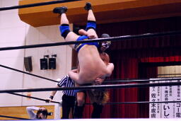日向寺はサスケの背中にパンチ、コーナーに上げてカナディアンバックブリーカーに(左写真)。