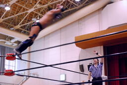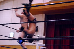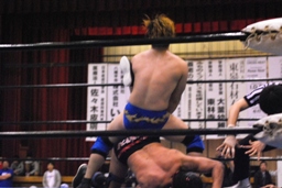 日向寺キャメルクラッチ(右写真)、サスケロープ。コーナーに振って串刺しエルボー、ムーンサルト狙ってコーナーに上る、サスケ起き上がって背後からパンチ。