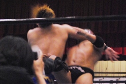 日向寺チョップ、サスケ逆水平(右写真)。さらにエルボーの打ち合い、サスケロープに飛ぶ、日向寺カウンターにラリアット。日向寺ロープに飛ぶ、サスケカウンターのソバット。