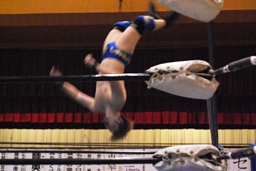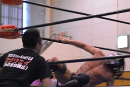 サスケは日向寺をトップロープに引っ掛けてコーナーからミサイルキック(左写真)、日向寺場外転落。