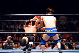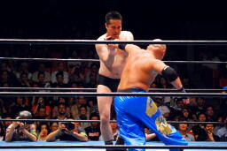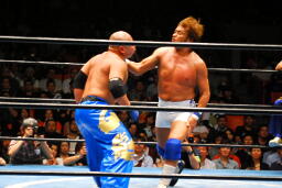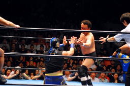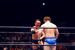 ウルティモ「FUNAKI、WWEでは世話になったな。今日は正々堂々とやろう」と握手を求める(右写真)。FUNAKIは警戒。しかし普通に握手。ロックアップ、FUNAKIがロープに押し込む、ウルティモ体勢入れ替えて逆水平。5分経過。