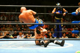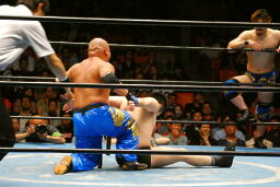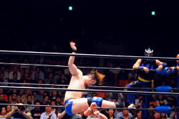 日向寺ストンピング、逆水平連打。ボディスラムからギロチンドロップ(右写真)、カウント1。野橋にタッチ。野橋ストンピング連打、ウルティモにタッチ。