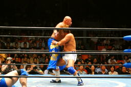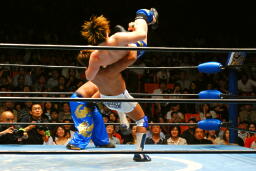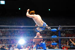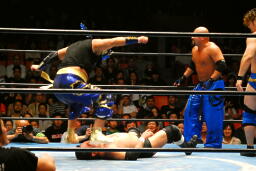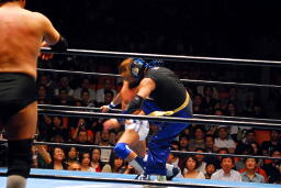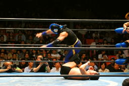 ウルティモコーナーに振って突っ込む、沼二郎かわしてジャンピングヒップアタック(左写真)、FUNAKIにタッチ。10分経過。