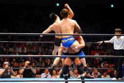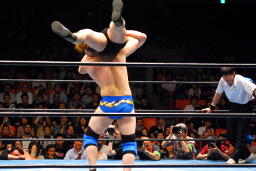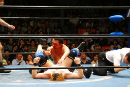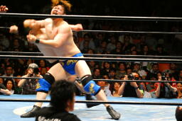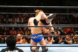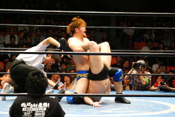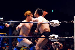 日向寺を野橋にぶつけ、日向寺にはバックドロップ(右写真)。