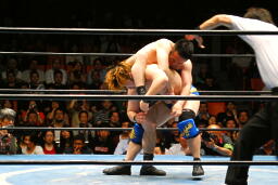 先発は野橋と大柳。ロックアップ、野橋が腕を取る、大柳切り返す(左写真)。野橋がさらに切り返す、大柳は独特の切り返し方を見せる。