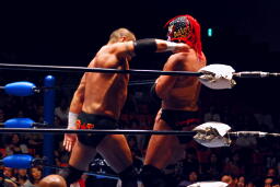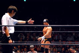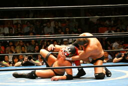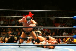 東郷コブラツイスト(右写真)、サスケロープ。東郷エルボースタッブからフェースロック。5分経過。