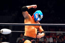 サスケが「みちのくひとり旅」で入場。オーバーマスクの右半分はSATO風(左写真)。