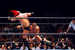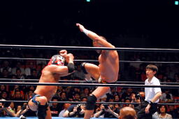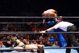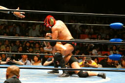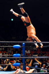 サスケは突っ込んできた東郷をショルダースルーで場外に落とし逆トペ(右写真)。10分経過。