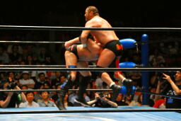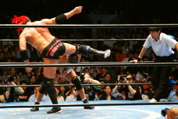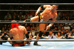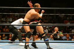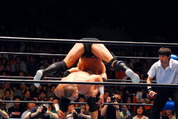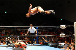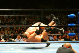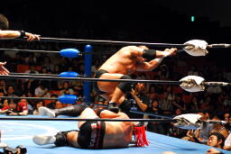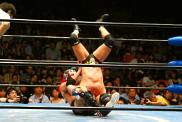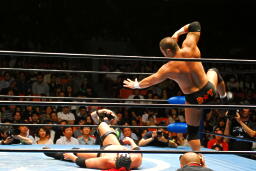 逆水平の打ち合いから東郷首投げ、フィストドロップ(左写真)、カウント2。