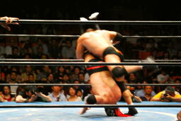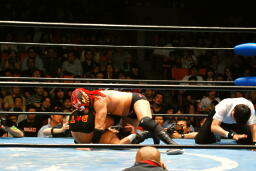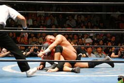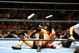 サスケがサンダーファイヤーパワーボム狙うが東郷はジャックナイフに(右写真)、カウント2。
