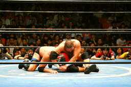 ロックアップ、東郷ロープに押し込む、ブレーク。再度ロックアップ、東郷バック取る、東郷カニばさみで倒してヘッドロック、サスケ切り返してキャメルクラッチに(左写真)。