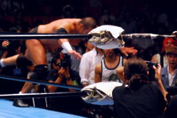 東郷コーナーに上る、そこを野橋が急襲(左写真)。「テロ予告」はしていたが、本当にこの試合に乱入するとは・・・。ラッセも入って2人を滅多打ち。