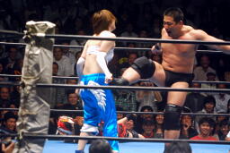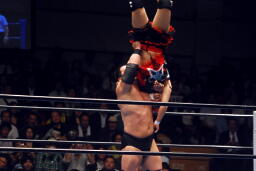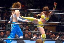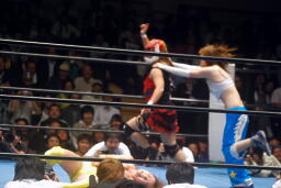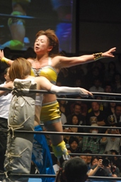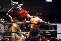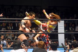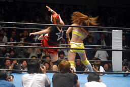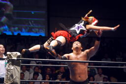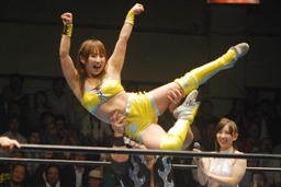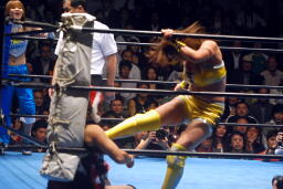 ナッキーはゆずポンの腕を取ってコーナーに駆け上ると高木にドロップキック(左写真)、ゆずポンをホイップ。
