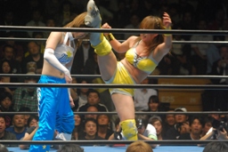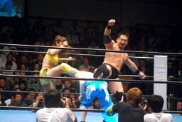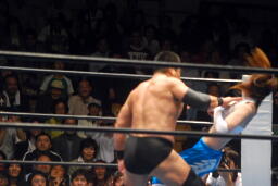 高木ドラゴンリングイン、ナッキーはドロップキックで迎撃(左写真)。
