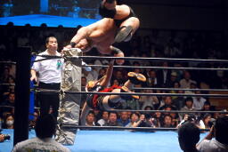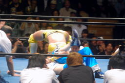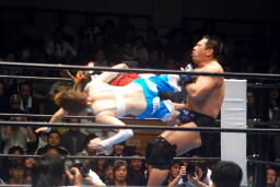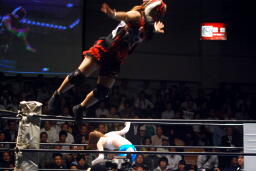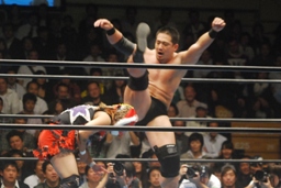 最後は岩谷がボディプレス(右写真)、カウント2。