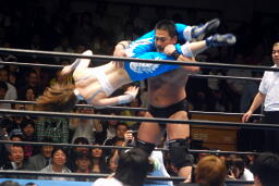 高木コーナーに上る、ナッキー雪崩式アームホイップ(左写真)。
