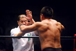 高木が和田京平レフェリーに必死に抗議するが京平取り合わない(右写真)。