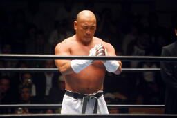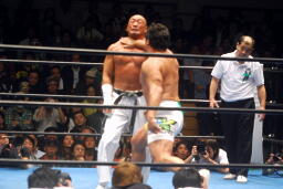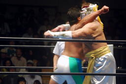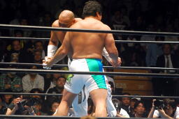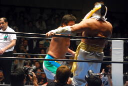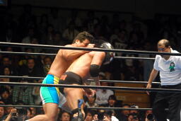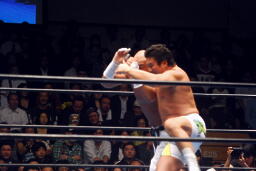 ロックアップ、健介がロープに押し込む、ブレーク。健介と人生手四つから力比べ(左写真)、健介が勝って腕をひねる、人生切り返す。健介切り返してヘッドロック、人生ロープに振ってショルダーブロックの打ち合い。