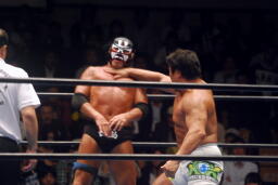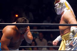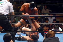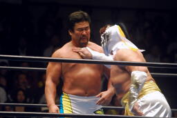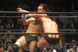 デヴィットロープに振ってヒップトス、カウント2。チンロックで絞り上げてカバー、カウント2。逆水平(左写真)3連打、カウント2。サムライにタッチ。