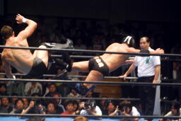 サスケヘッドロック、デヴィットロープに振る、ロープワーク、互いにかわし合い、ドロップキックは相打ちに(右写真)。健介と人生にタッチ。