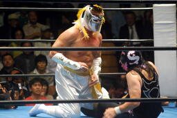 健介ラリアット(左写真)。大ハヤブサは人生にタッチ。