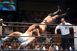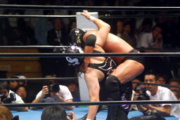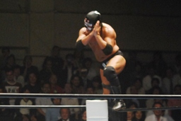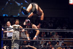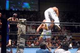 サムライガットショット、ネックブリーカードロップ(右写真)、カウント2。サムライナックル連打、コーナーに振る、サスケコーナーに上る。