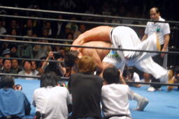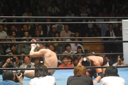 ロックアップ、サムライロープに押し込んでチョップ(左写真)、大ハヤブサ動じない。