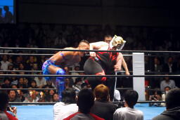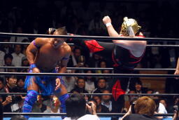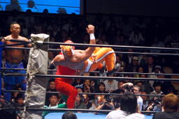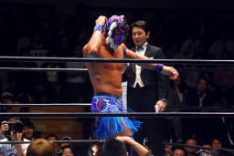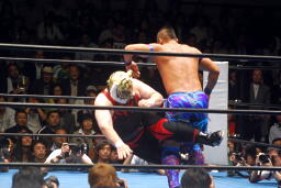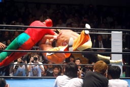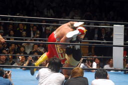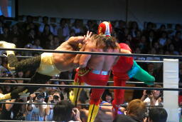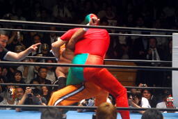 ゲレーロをロープに振ってフライングクロスアタック(右写真)。