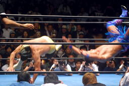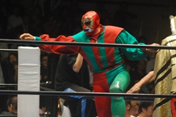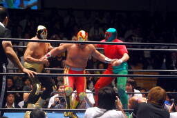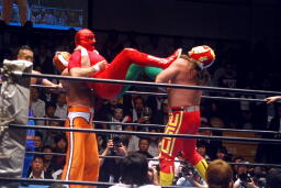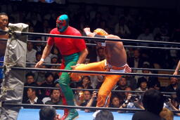 ゲレーロが入る、マスカラス兄弟がダブルでロープに振る(左写真)、