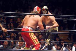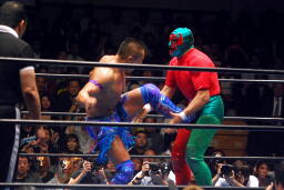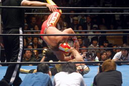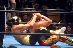 マスカラスは手四つからコークスクリューシザーズ(左写真)でゲレーロを何度も投げる。