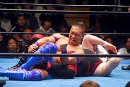 ドス弓矢固め、4代目カバー、カウント1。ドスはカニばさみで倒してハンマーロックに固める(右写真)、