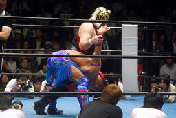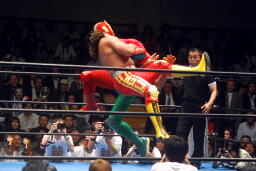 フルネルソンの掛け合い、マスカラスは前方にスナップメイヤーで投げてボディシザーズ(右写真)。